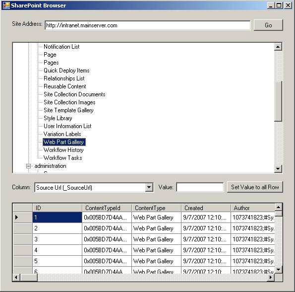 This is a SharePoint site object browser application. In the textbox, followed by label Site Address, enter a SharePoint site address and then press Go button. You will see all subsites and content of subsites will be generated in a tree form in the TreeView control. In that control, if you click on a tree node of type list then the list’s contents will be shown in the bottom DataGridView. In the Grid you will find all columns and rows of that particular list. Even some columns, you will see here, will not be visible from SharePoint site. You can also select a column from the DropDownList and can update value for all rows for that particular column. But as I told, you will be able to see some SharePoint internal columns, those values we can not update.
