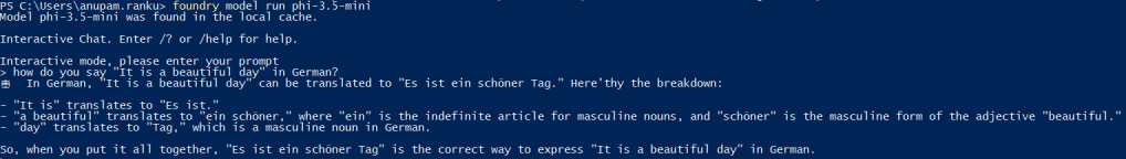 Once the model is running, you can interact with the model. In the following example, I have asked the phi-3.5-mini model to translate “It is a beautiful day” in German, all within the Windows command prompt. This simple model can translate about 23 languages! You can find more details about that model here.