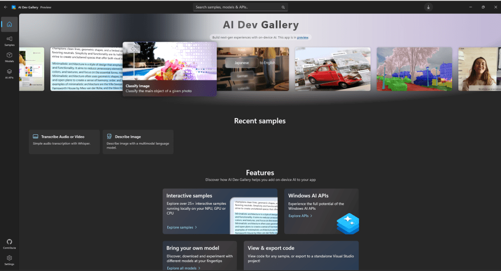 Another great tool Microsoft recently released is the AI Dev Gallery: aka.ms/ai-dev-gallery. This tool enables developers to explore and integrate on-device AI functionality into their applications.